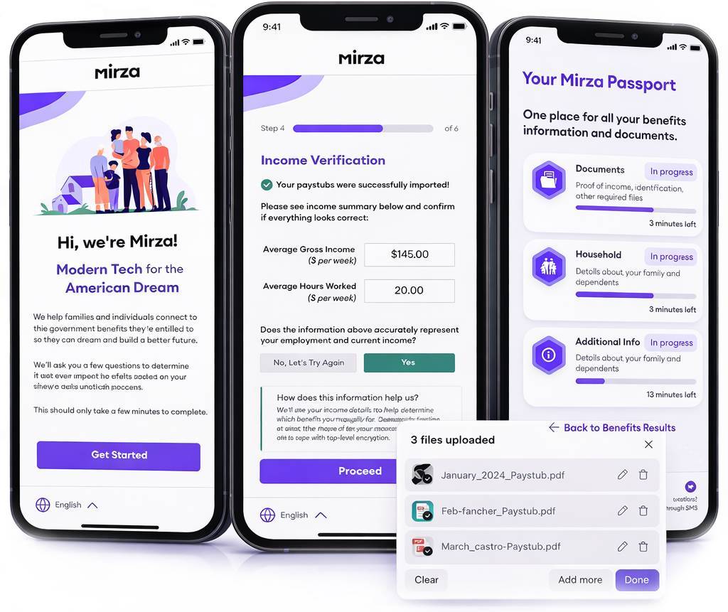 Mirza operates a benefits access platform that unifies eligibility screening, application processing, and compliance management across multiple government benefit programs. The company serves three distinct customer segments through a shared technology infrastructure: